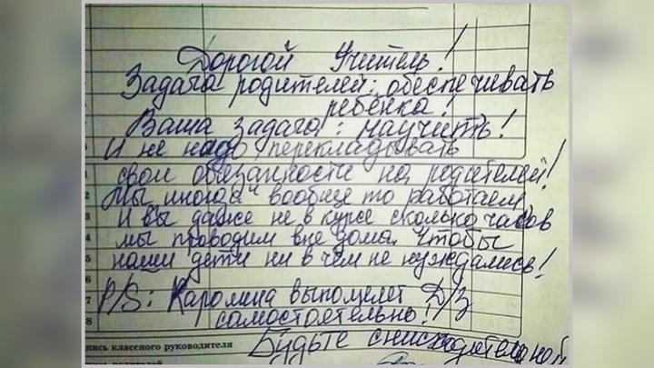 На днях мне попался дневник с такой заметкой от родителей, адресованной учителю. Просто крик души мамы. И куча комментариев к ней с общим содержанием: "Учителя сейчас не учат и не хотят учить, они только проверяют, как дома научили родители".