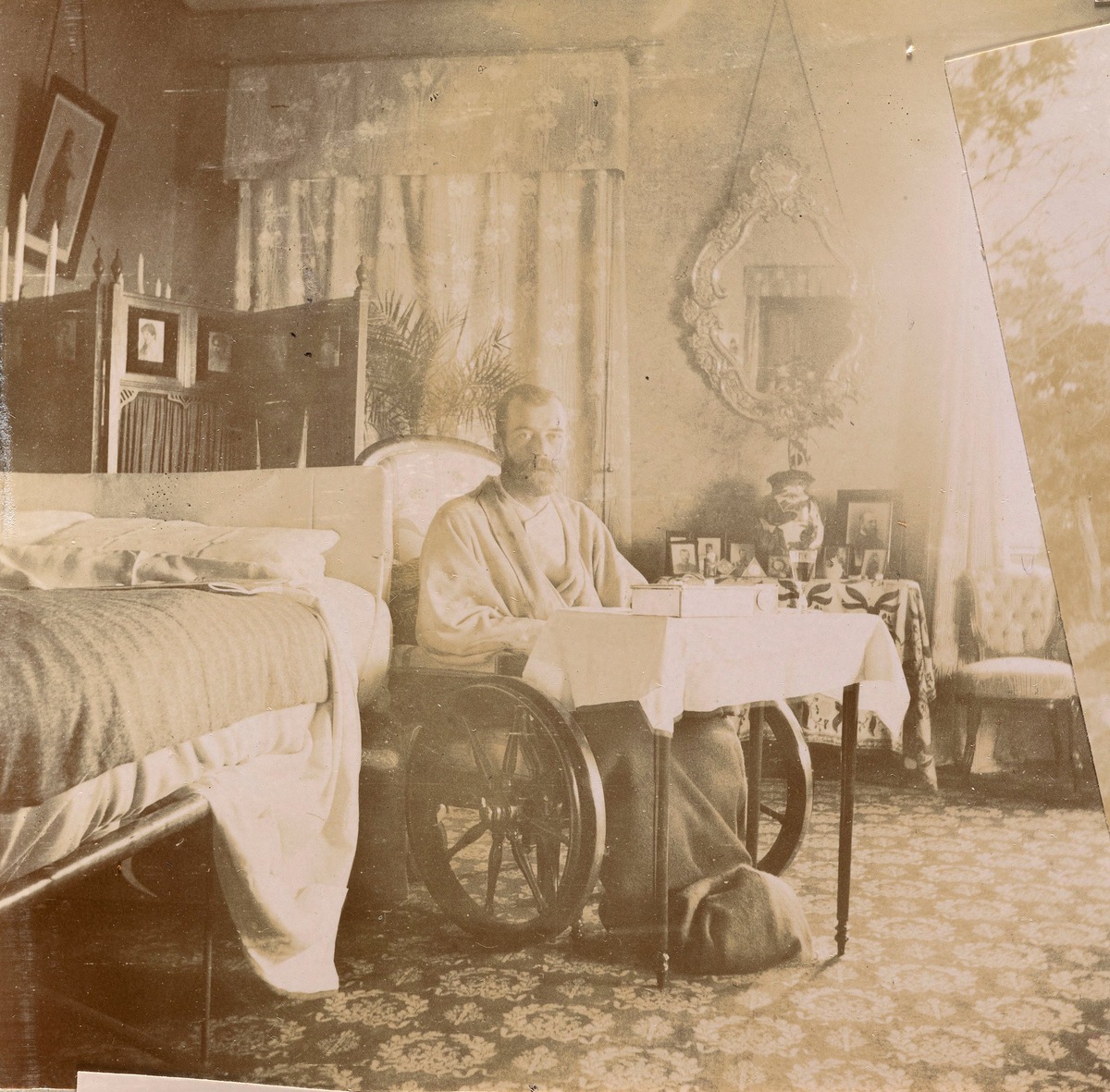Π¦Π°ΡΡ ΡΠΈΠ΄ΠΈΡ Π² ΠΈΠ½Π²Π°Π»ΠΈΠ΄Π½ΠΎΠΌ ΠΊΡΠ΅ΡΠ»Π΅ Π·Π° ΠΌΠ°Π»Π΅Π½ΡΠΊΠΈΠΌ ΡΡΠΎΠ»ΠΈΠΊΠΎΠΌ. Π ΡΠ΄ΠΎΠΌ Ρ Π½ΠΈΠΌ - Π½Π΅Π±ΡΠ΅ΠΆΠ½ΠΎ ΠΏΡΠΈΠΊΡΡΡΠ°Ρ ΠΊΡΠΎΠ²Π°ΡΡ, Π½Π° Π·Π°Π΄Π½Π΅ΠΌ ΠΏΠ»Π°Π½Π΅ - ΡΡΠΎΠ»ΠΈΠΊ Ρ ΡΠ΅ΠΌΠ΅ΠΉΠ½ΡΠΌΠΈ ΡΠΎΡΠΎΠ³ΡΠ°ΡΠΈΡΠΌΠΈ, Π° ΡΠ°ΠΌ ΠΎΠ½ Π² Ρ Π°Π»Π°ΡΠ΅ ΠΈ ΡΠΊΡΡΠ°Π½ Π² ΠΏΠ»Π΅Π΄.