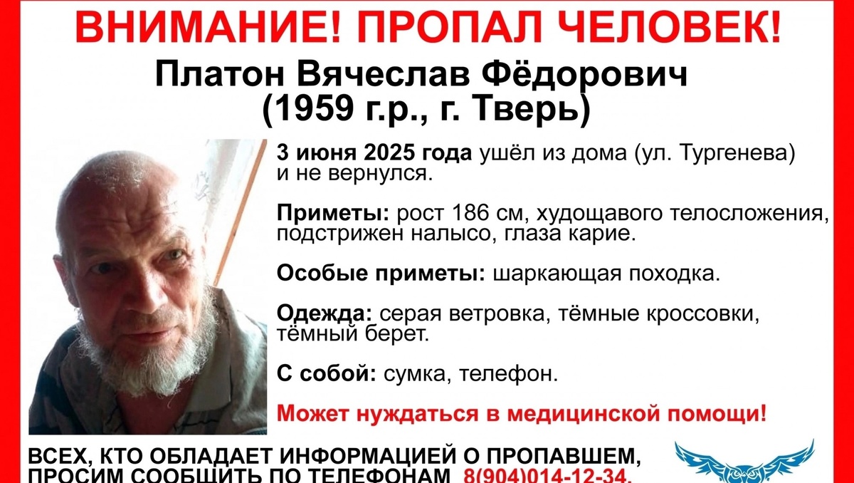 В Твери ушел из дома на улице Тургенева и не вернулся 66-летний Вячеслав Федорович Платон. Как сообщает тверской волонтерский поисково-спасательный отряд "Сова", местонахождение мужчины не известно с 3 июня. Приметы: рост 186 см, худощавого телосложения, подстрижен налысо, глаза карие. Одежда: серая ветровка, тёмные кроссовки, тёмный берет. Особые приметы: шаркающая походка. С собой: сумка, телефон. Волонтеры просят сообщать информацию о пропавшем в отряд по телефонам: в отряд по телефонам: 8 (910) 646-34-34 и 8 (904) 014-12-34