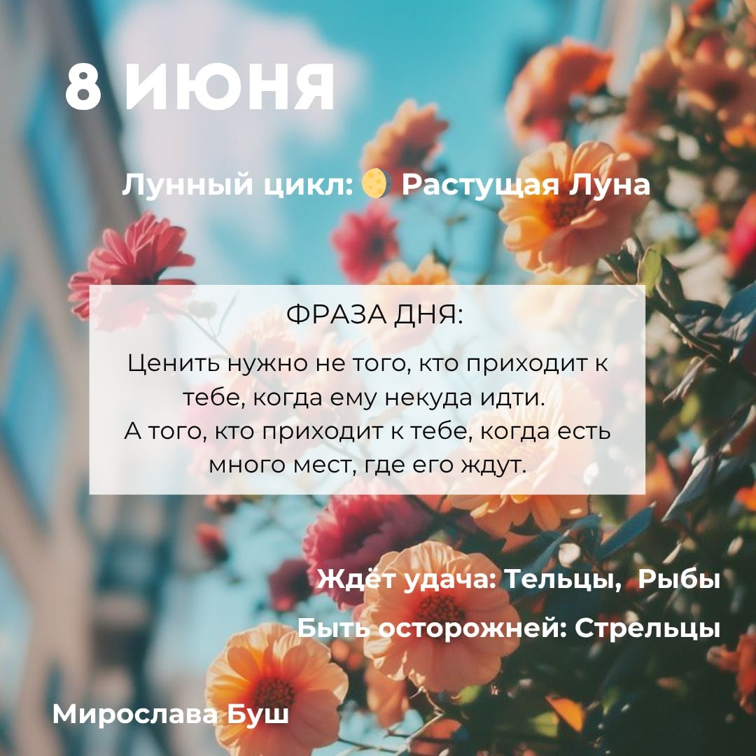 8 июня РЕКОМЕНДАЦИИ: ❌ Не ешьте ссорясь или торопясь. Проглотите негатив, и весь день будут преследовать неудачи. ⭐️ Завтра идёт сильный сброс старого. Всё, что будет "отваливаться" — отпускайте без сопротивления, это не ваше, не тяните назад. ⚠️ Любая неопределённость — знак стоп. Завтра важно двигаться только туда, где ясно. ✉️ Подписаться на Мирославу #прогнознадень