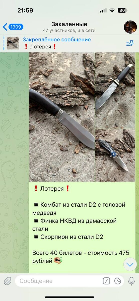 В платном чате (400 рублей в месяц) запустил лотерею на 3 ножа