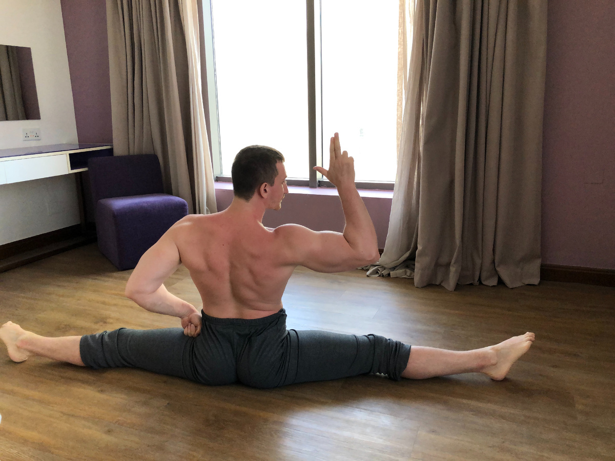 Сидячий шпагат: Сядьте на пол, разведите ноги в стороны как можно шире. Постарайтесь удерживать спину прямой и медленно наклоняйтесь вперед, стараясь дотянуться до пола. Удерживайте позицию 20-30 секунд. Это упражнение поможет развить гибкость в области бедер и паха.