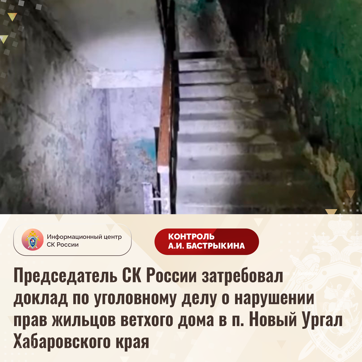 Председатель СК России затребовал доклад по уголовному делу о нарушении прав жильцов ветхого дома в п. Новый Ургал Хабаровского края В социальной сети сообщается о ненадлежащем обслуживании многоквартирного дома по улице Киевской в поселке Новый Ургал Хабаровского края. Несущие конструкции здания, 1984 года постройки, разрушаются, кровля протекает, подвальные помещения затапливаются стоками, на стенах образовалась плесень, инженерные системы неисправны. Несмотря на имеющиеся нарушения, мер к их устранению длительное время не принимается. Многочисленные обращения граждан результатов не принесли. Ранее А.И. Бастрыкин ставил указанную ситуацию на контроль в центральном аппарате ведомства. В СУ СК России по Хабаровскому краю и Еврейской автономной области расследуется уголовное дело. Председатель Следственного комитета Российской Федерации Александр Иванович Бастрыкин затребовал у руководителя СУ СК России по Хабаровскому краю и Еврейской автономной области Станислава Юрьевича Белянского