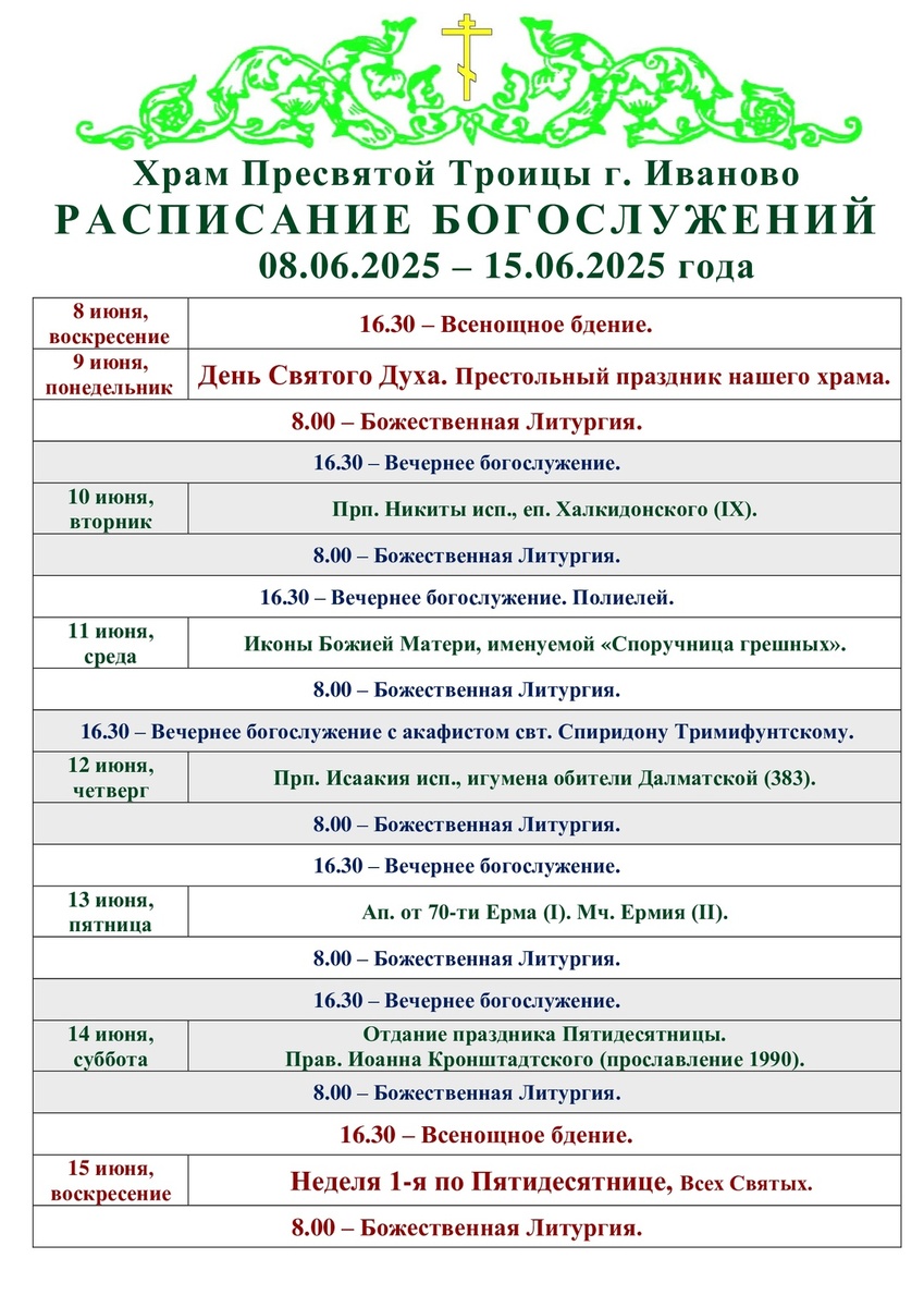 08-15.06. Расписание богослужений в Троицком храме г. Иваново