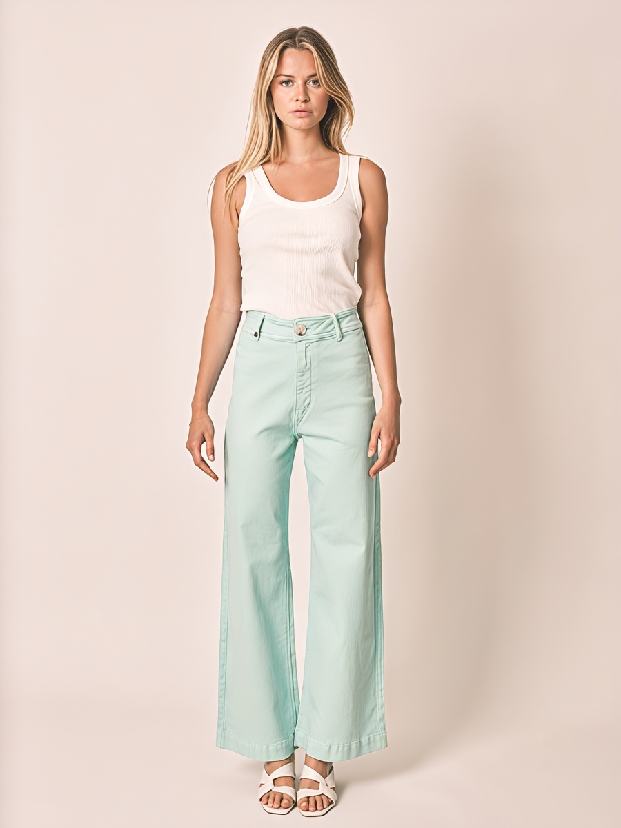 Цветной деним — отдельная тема для разговора. Розовый, мятный, лавандовый — эти оттенки далеки от кричащих тонов. Они мягкие, припыленные, благородные. Особенно хороши в сочетании с нейтральными цветами.