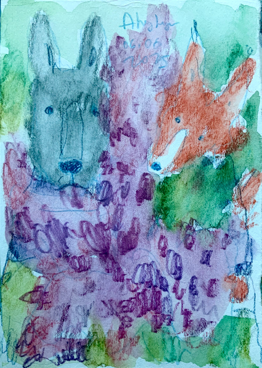 Волчок и Лисичка в зарослях сирени. Может быть, это укрытие! А может, им просто нравится нюхать сирень. * Рисунок получился несколько импрессионистским, а Лисичка и Волчок более серьезными, чем обычно. * Лайн, носы и глаза выполнены водостойкими карандашами. Остальное — акварельные карандаши и водоразмываемый тонированный графит.