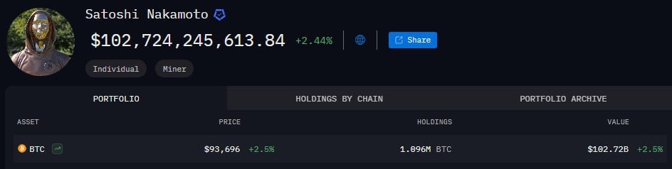 Сатоши Накамото побил новый рекорд☝🏻 Создатель биткойна владеет самым крупным крипто кошельком в мире с 1,1 млн BTC В связи с ростом курса BTC состояние кошелька перевалило за $100 млрд ($102.7 млрд по текущему курсу) Эти деньги до сих пор никуда не перемещались и не были тронуты создателем — человек легенда🫡 #новости