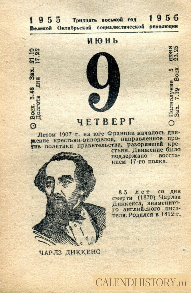 Итак, сегодня 9-июня мая и у нас на календаре 1955-й год. Перед нами листок советского календаря Политиздата. На календаре у нас четверг - 9 июня 1955-го года. ЧАРЛЗ ДИККЕНС Летом 1907 г. на юге Франции началось движение крестьян-виноделов, направленное против политики правительства, разорявшей крестьян. Движение было поддержано восстанием 17-го полка. 85 лет со дня смерти (1870) Чарлза Диккенса, знаменитого английского писателя. Родился в 1812 г. *** Оборотную сторону листка этого календаря можно посмотреть у нас по ссылке на сайте. Другие листки советских календарей смотрите у нас на сайте - CALENDHISTORY.ru ПОСМОТРИТЕ ЕЩЁ ЛИСТКИ ОТРЫВНЫХ КАЛЕНДАРЕЙ: