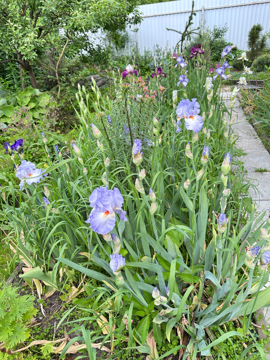 Так и хочется продолжить по стихотворению из Детства – «а у вас?». Но нет, не про вашу погоду не надо. Я про свою вчерашнюю. Ничего не предвещало, хотя предупреждений было предостаточно. И очень мило по радио сообщали, что вот уже в таком-то районе Подмосковья гремит-льёт-бьёт, а такому-то району приготовиться через полчаса. Так что когда у нас на горизонте нарисовался изумительный свинцово-мрачный угрюмый и набрякший фронт – ни паники, ни спешки. Все равно уже ничего не спасешь/не подготовишь. Разве что внести под крышу разбросанное, да прикрыть двери-окна. Совершенно иным взглядом смотрел на сад – господи, как все уязвимо! Как много всего этого зеленого, устремленного, сочного, цветущего может быть легко согнуто, поломано, порвано. Ирисы бородатые только начали цвести. Цветоносы в этом году высоченные, цветки же у сортовых крупные, хрупкие. Все не укроешь, не подвяжешь все равно. Так хоть сфотографирую перед бурей (увижу ли их потом). _____________________________ И мощно рвануло: