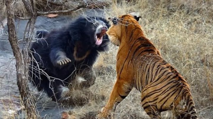 Стоит отметить, что в подавляющем большинстве случаев физический контакт между тигром и медведем является незначительным, и ни один из животных не получает серьёзных травм. На средних и дальних дистанциях медведи-ленивцы реагируют на тигров различными способами, в том числе убегают, или наоборот, стоят на месте, пристально наблюдая за кошкой. Но при приближении медведь замечает тигра в радиусе трех метров, и почти всегда реагирует яростным взрывом, вставая, а затем бросаясь на соперника. Одна оборонительная атака, как правило, завершает большинство подобных схваток, закрепляя общий успех данной стратегии.