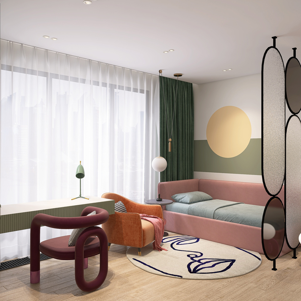 📐 Площадь: 27,5 м² Это не просто яркий интерьер — это пространство, где сочетаются геометрия, ритм, характер и свобода.