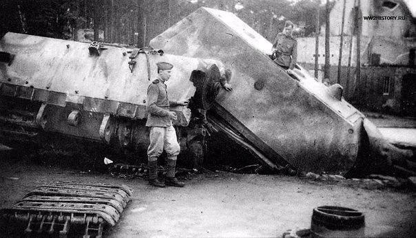 Coлдaты Kpacной Apмии ocмaтривают взорванный сверхтяжёлый немецкий танк «Maus», июнь 1945 годa.