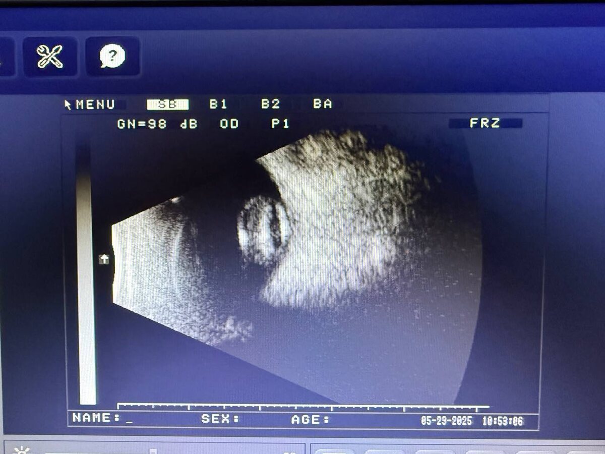 Картина «на дне». Когда долго ждали что пройдет само, а оно не прошло, да еще и уплыло. У пациентки 80+ глаз долгое время не видит, сперва была обычная катаракта, но в силу нежелания ее лечить, в конце концов, помутневший хрусталик решил утопится и сместился в витреальную полость. В положении лежа лежит на зрительном нерве, хорошо видно по УЗИ. Ну а глаз ослеп не из-за этого, а из-за вторичной глаукомы, развившейся в конечном итоге. Причина обращения - стал хуже видеть другой глаз. Поскольку он последний, то снижение зрения уже мешает. Решили судьбу второго глаза не повторять, будем оперировать.