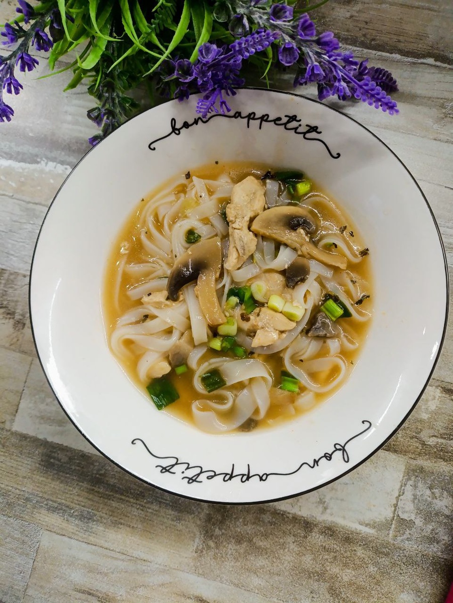 Обжарила филе курицы и шампиньоны с луком, добавила воды, соевого и устричного соусов, соли, жгучего перца, сока лайма, базилика, соли, забросила лапшу и зеленый лук.