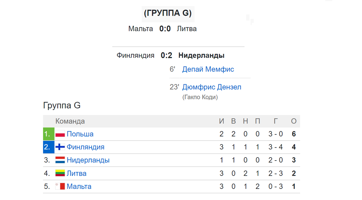 В другой игре группы G между сборными Финляндии и Нидерландов было забито два мяча. Забегая вперед скажу, что гости не испытали проблем в этой игре. Отличиться смогли Мемфис Депай (6-я минута) и в первом тайме расписался Дензел Дюмфрис (23-я). Нидерланды уверенно переиграли Финляндию в квалификации чемпионата мира со счетом 2:0.