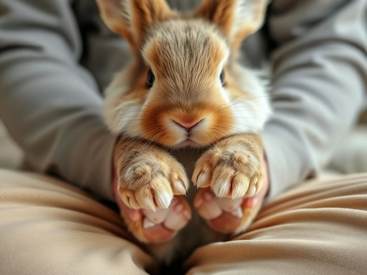1. Удобная посадка. Один из лучших способов: посадите кролика *хвостиком к себе* на свои колени (можно на столе, подстелив не скользящий коврик), лицом от себя. Одной рукой нежно, но уверенно придерживайте его за грудь, прижимая к вашему телу. Так вы видите лапы спереди, кролик надежно зафиксирован и меньше видит «страшные» действия руками.