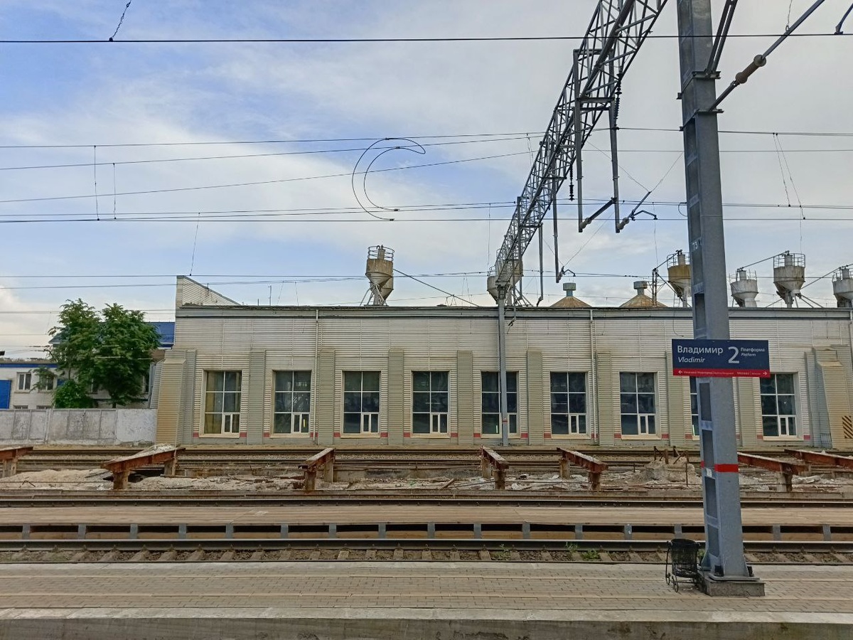 На владимирском вокзале ремонтируют перрон. Между вторым и третьим путями сделали низкую деревянную платформу.
