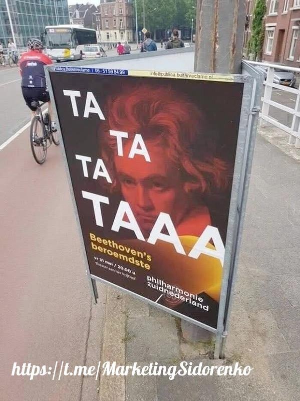 Та-та-та-тааа. Креативные специалисты из Нидерландов представили великолепный постер — концерт Пятой симфонии Бетховена был анонсирован всего четырьмя словами и изображением знаменитого композитора. Возможно, это самая впечатляющая реклама классической музыки за всю историю — даже те, кто никогда не слышал имя Бетховен, сразу поняли, о чём идёт речь. Минимализм, доведённый до крайности и одновременно до гениальности.