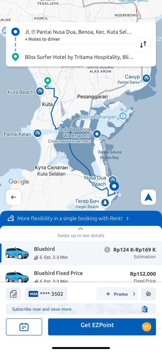 Голубое такси и платная дорога на Бали. Решили съездить на другой пляж, заодно освоить местное такси. 16 км ~ 30 минут, все через приложение, при посадке надо сказать водителю код, который формируется автоматически при заказе, только после ввода его в таксометр активируется поездка, почему именно такая реализация не знаю, но прикольно, похоже на какую-то дополнительную защиту клиентов или водителей. В общем все очень прилично, вежливо, английский у водителей не очень, но тут почти все местные очень коряво разговаривают, тоже самое было в Индии, удивительно, но все прекрасно понимают друг друга 😁.