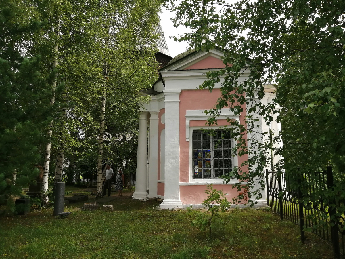 Спасо-Прилуцкий Дмитриев монастырь.Люблю здесь бывать. В этот раз приехала в канун Троицы. Прошла по традиции к могиле поэта Константина Батюшкова. И вдруг увидела,что открыты двери маленькой церковки. Ранее всегда закрытая,с красивыми витражными окнами,привлекала взор своей таинственностью.Что же там? Поискала информацию. Церковка в виде ампирного храма, украшенного четырьмя портиками (состоящего из двух колонн каждый) и покрытого куполом». (Лукомский). К востоку от Введенской трапезной церкви стоит миниатюрное ампирное сооружение камерного характера, напоминающее своими четырьмя портиками и куполом садово-парковый павильон. Это — Екатерининская церковь-мавзолей, построенная в 1830 г. вологодским помещиком В. Волоцким над могилами своих родственников. По соседству с мавзолеем расположена могила известного поэта К. Н. Батюшкова». (Бочаров, Выголов). В 1830 году в северо-восточной части монастырской территории, недалеко от Введенской церкви, построена Екатериненская часовня-ма