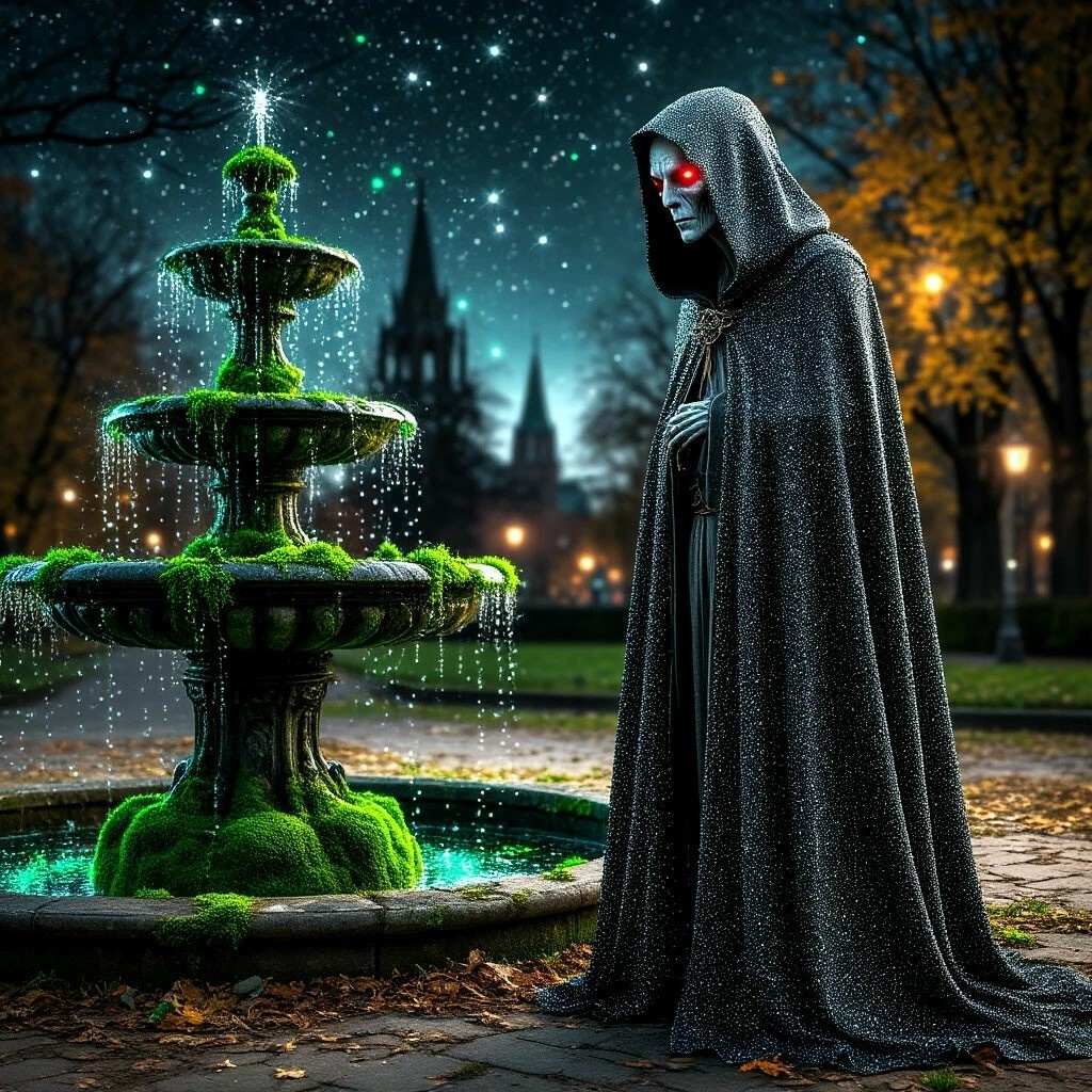 Небо было чистым и звездным, усыпанным бриллиантами, словно кто-то небрежно рассыпал горсть драгоценностей по бархатному полотну. Забытый всеми парк за городом, некогда шумный и полный жизни, теперь погрузился в тишину, нарушаемую лишь шелестом листьев и уханьем совы. В центре парка, словно окаменевший свидетель ушедшей эпохи, стоял старый, покрытый мхом фонтан. Вода давно не журчала в его чаше, а потрескавшиеся бортики заросли мхом.
