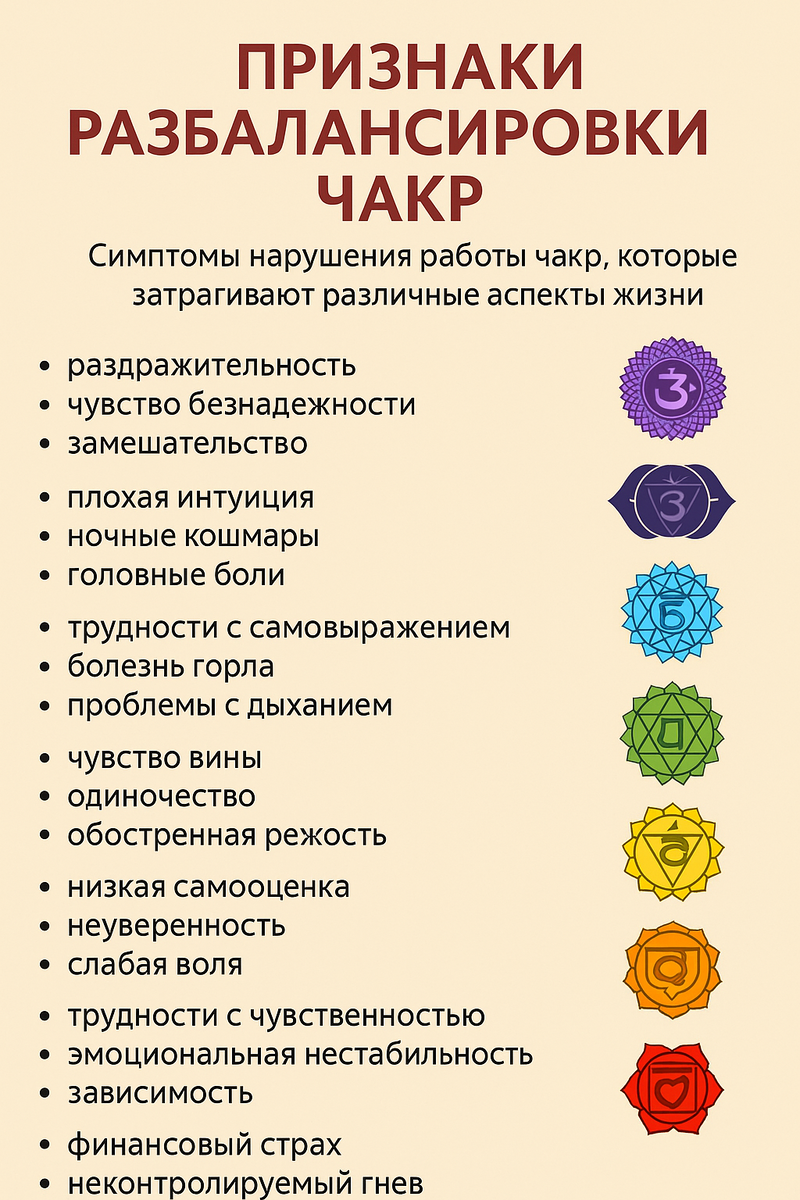 Энергетическая система человека — тонкий механизм. Как только какой-либо элемент выходит из равновесия, это сказывается на теле, разуме и эмоциональном состоянии. Одна из главных причин внутренних конфликтов, болезней и неудовлетворённости — разбалансировка чакр. Эта статья поможет распознать признаки, по которым можно определить, что одна из чакр работает нестабильно. Каждая чакра отвечает за определённую сферу жизни. Когда энергия в ней течёт свободно, человек чувствует уверенность, любовь, вдохновение или интуицию. Но если возникает блок или, наоборот, гиперактивность — появляются симптомы на физическом, эмоциональном и ментальном уровне. Распознавание этих признаков позволяет вовремя вмешаться и восстановить внутреннюю гармонию до того, как состояние усугубится. Важно отметить: чакра может быть не только заблокированной, но и чрезмерно активной. Например: Баланс — ключ к гармонии. Не избыток, и не нехватка энергии, а именно равновесие создаёт целостность. Чакры — не мистическая