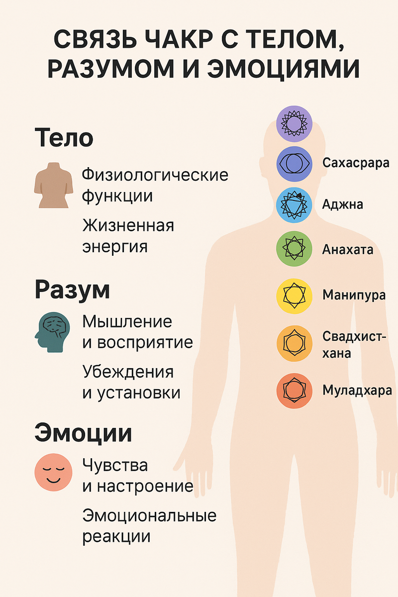 Современный подход к человеку всё чаще опирается не только на биологию или психологию, но и на энергетическую модель. В этой модели человек — это неразрывное единство тела, разума и эмоций, где чакры играют роль ключевых энергетических узлов. Они регулируют, направляют и отражают состояние всех этих уровней. Баланс чакр напрямую влияет на то, как мы чувствуем себя физически, какие мысли нас посещают и как мы переживаем эмоции. Каждая чакра связана с определёнными органами, железами внутренней секреции и физиологическими функциями. Например: Таким образом, здоровье тела — это отражение гармонии энергетических центров. Чакры влияют на наше восприятие мира, способность мыслить ясно, принимать решения и формировать убеждения. Чакры и разум работают как система фильтрации: через них проходят все ментальные процессы и закрепляются убеждения. Эмоциональное здоровье тесно связано с чакровой системой. Блокировки или чрезмерная активность чакр могут вызывать деструктивные эмоциональные патте