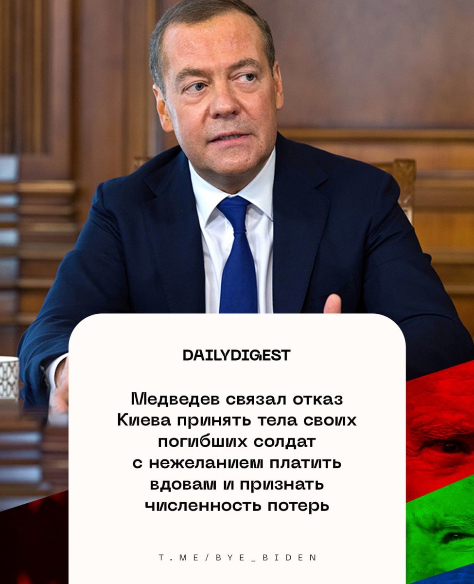 🔹Медведев связал отказ Киева принять тела своих погибших солдат с нежеланием платить вдовам и признавать численность потерь.