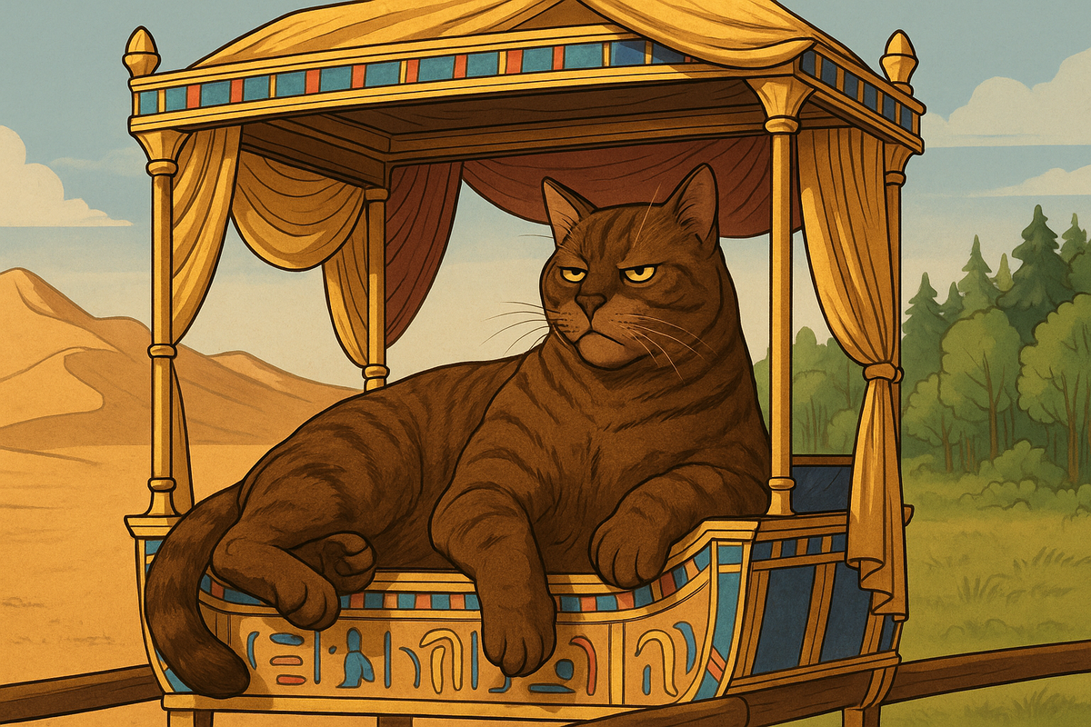 Вот представьте себе Страшилу, восседающего в позолоченном паланкине, плывущем по рекам и землям на Русь. Да, ему бы понравилось: ветер в усы, личный раб, подушки из египетского хлопка, фрукты в серебряной миске. Рамзес — лучший друг, а многокотный отец — как минимум визирь.