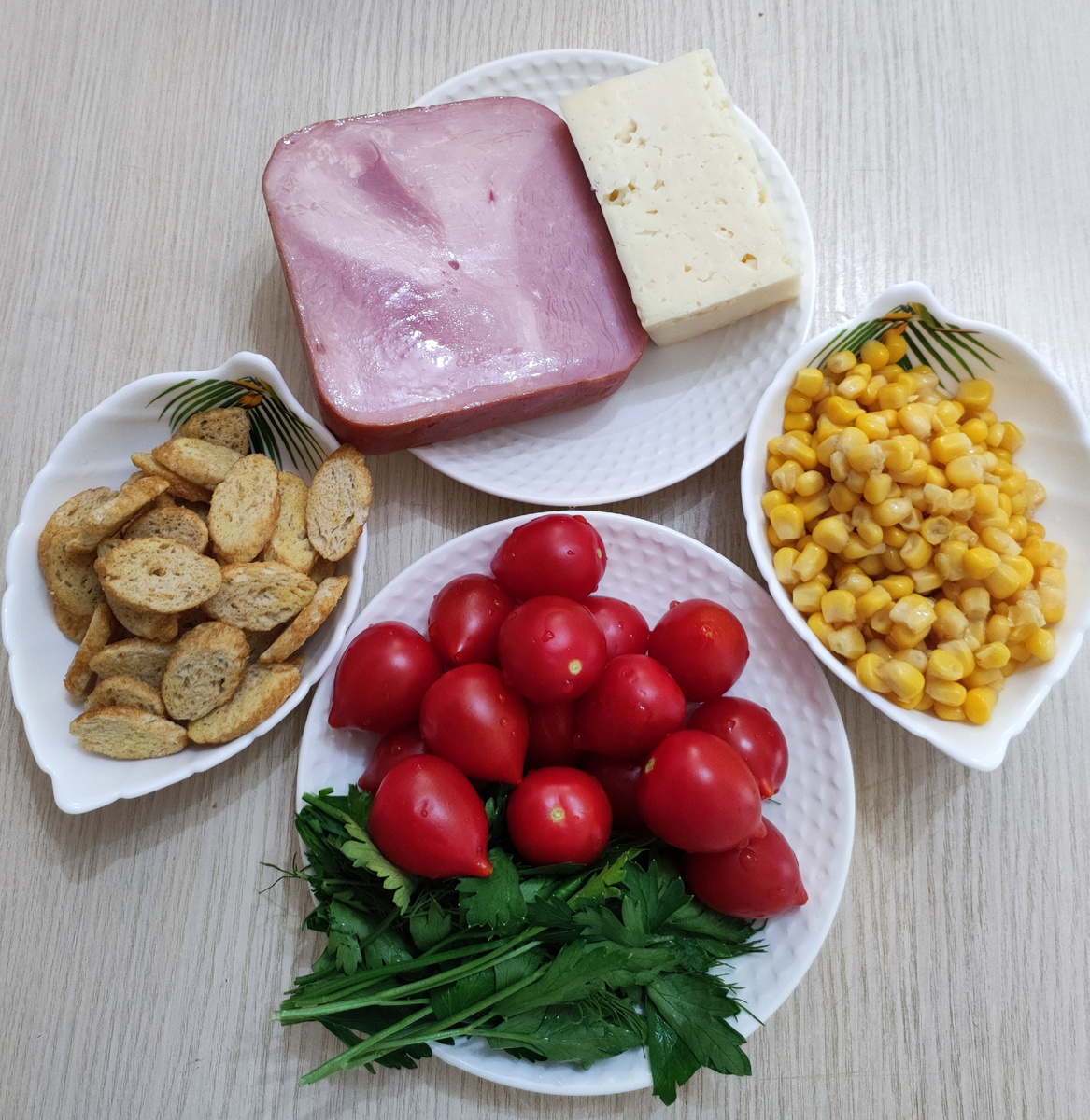 Доброе утро, друзья! Всем хорошего летнего настроения и море позитива! А я хочу сегодня приготовить быстрый и очень вкусный салат. Варить ничего не надо. Времени потребуется минимум, а получается очень вкусно. Ингредиенты: - Ветчина — 200 г - Консервированная кукуруза — 1 банка (около 200 г) - Помидоры черри — 200–250 г - Чеснок — 2 зубчика - Зелень (укроп, петрушка) — небольшой пучок - Твердый сыр (например, российский или пармезан) — 70–80 г - Сухарики ржаные или пшеничные — около 100 г - Майонез или сметана для заправки — по вкусу - Соль, перец — по вкусу Приготовление: Нарежьте ветчину небольшими кубиками или полосками. Разрежьте помидоры черри пополам или четвертинками. Сыр натрите на крупной терке или порежьте тонкими ломтиками. Измельчите зелень ножом. Чеснок очистите и измельчите прессом или ножом. Смешайте нарезанные ветчину, помидоры черри, консервированную кукурузу, измельченный чеснок и зелень в глубокой миске. Добавьте натертый сыр и перемешайте аккур