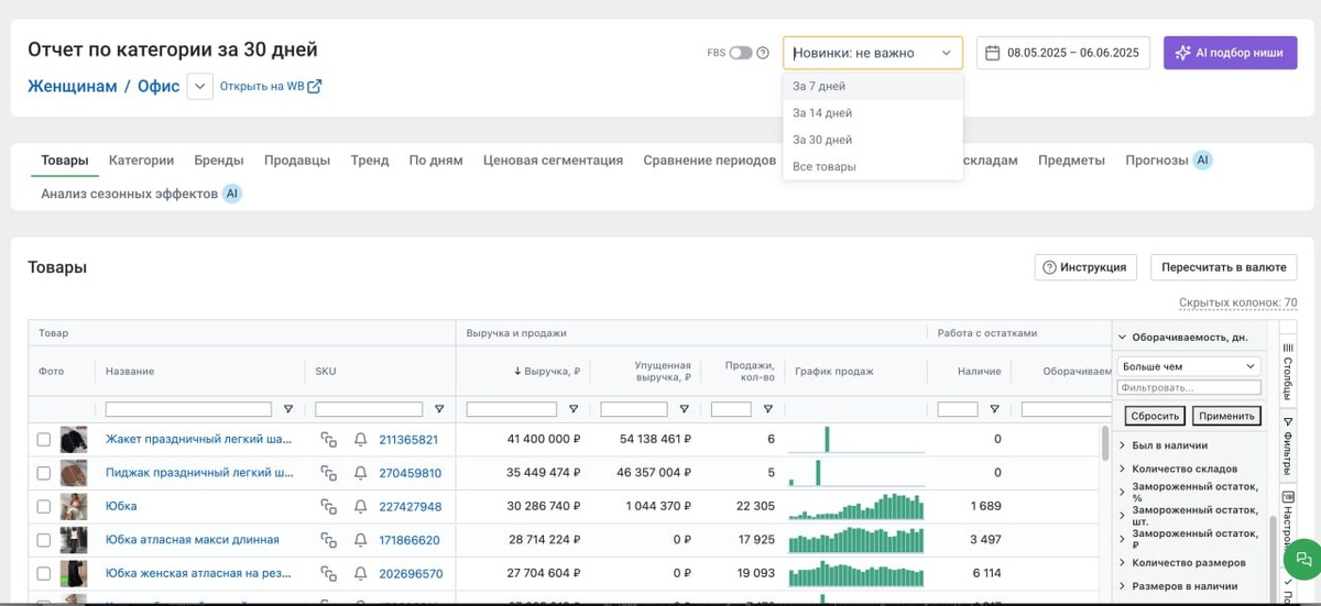Как я ищу нишу — один из моих рабочих способов Методов подбора ниш куча, и я постоянно тестирую новые. Интересно, что разные подходы часто приводят к одним и тем же товарам — это хороший знак. Ниже делюсь простым, но эффективным методом, который периодически использую сам: 1. Захожу в MPStats → выбираю интересующую категорию и жму «Показать всё». 2. Ставлю фильтр «Новинки» (за последние 30 дней) и добавляю оборачиваемость — обычно 30–45 дней. Это помогает найти свежие товары, которые уже начали хорошо продаваться. 3. Далее ограничиваю отзывы до 100 — так отсеиваются старые позиции и остаются только новые, без склейки. Если товар свежий и уже идёт — значит, в нише точно есть движение. 4. Нашёл что-то интересное — сразу иду смотреть весь магазин продавца. Часто там попадаются другие товары, которые не видны с первого взгляда. 5. При ограниченном бюджете (например, 300–500к) можно включить фильтр по выручке. Я чаще просто сортирую по цене — от дорогих к дешёвым, чтобы понять, где есть по