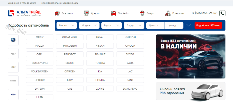 Альта Трейд — это автосалон в Симферополе. Его физическое существование ставится нами под сомнение, так как на картах по этому адрес расположен другой салон — бывший Авангард, дилер из нашего черного списка. Автосалон на ул. Бородина 12 в Симферополе — это Аврора (бывший Авангард). Дилер находится в нашем черном списке. Неудивительно, что салон с плохой репутацией использует «левые» сайты для сбора заявок. Альта Трейд — один из них. Итак, в каталоге вымышленного дилерского центра Альта Трейд представлены автомобили с пробегом. Цены снижены, на сайте нет ни публичной оферты, ни верифицированных отчетов о состоянии автомобилей. Подтверждением того, что АЦ Альта Трейд и Аврора (Авангард) — один и тот же салон, — является и ООО, указанное на лендинге. Согласно информации, размещенной в футере сайта, владельцем вымышленного салона является все тоже ООО «АВРОРА» (ИНН 6165235622). Это юридическое лицо указано на сайте бывшего Авангарда и ряда других салонов из нашего черного списка. О компани