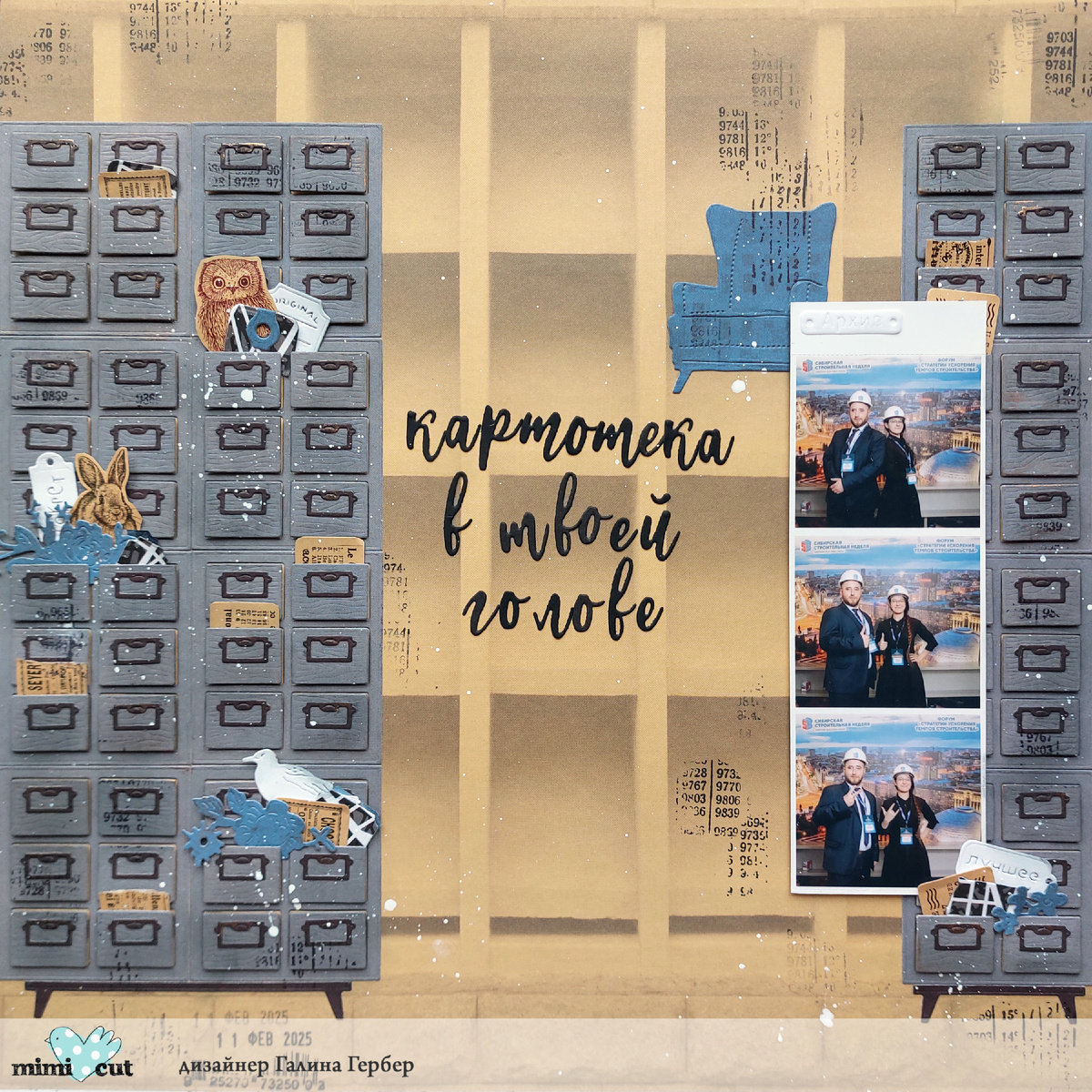 Всем привет! С вами Галина Гербер. Когда я увидела новый набор ножей "Картотека", мне сразу пришла идея попробовать создать огромный стеллаж с большим количеством ящиков. Мне подумалось, что неплохо было бы, чтобы вся информация, которую человек узнаёт в течении жизни, собиралась в такие вот ящички. В таком архиве уж точно ничего не потеряется, и нужная формула или график легко всплывёт в памяти на экзамене. Но также пусть бы там оставалось место для хранения воспоминаний о любви, настоящей дружбе и самых счастливых моментах. Это важнее каких-то там наборов цифр и букв. Так родилась страничка под кодовым названием "Картотека в твоей голове". Шильдики из наборов "Слайд-шоу", "Коктейль на пляже" и "В спичечном коробке" кокетливо выглядывают из ящиков. Сет "Написано пером" помог с заголовком. Также в создании странички приняли активное участие ножи: "Картотека", "Ангельское пение", "Прилетела белая чайка", "Про отдых", "Весенняя гирлянда". Ну и завершающий штрих - торчащие из ящиков винт