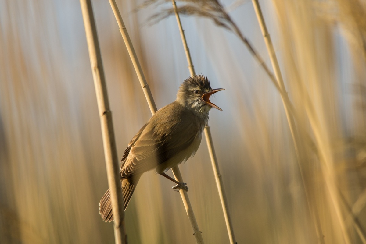 Еще один очень громкий, несмотря на миниатюрные размеры, обитатель тростниковых зарослей – соловьиная широкохвостка, или широкохвостая камышовка. Громкая брачная позывка самцов этого вида звучит намного приятней. Пропев свою песенку, самец обычно ненадолго затихает, чтобы оглядеться, перебраться на другое место и снова запеть. Узнать этих птичек можно по серой грудке, а также довольно плотному телосложению и короткой шее. Кстати, эти насекомоядные птицы зачастую остаются зимовать в Астраханской области, и даже в холодное время находят в тростниках паучков, насекомых и их личинок.