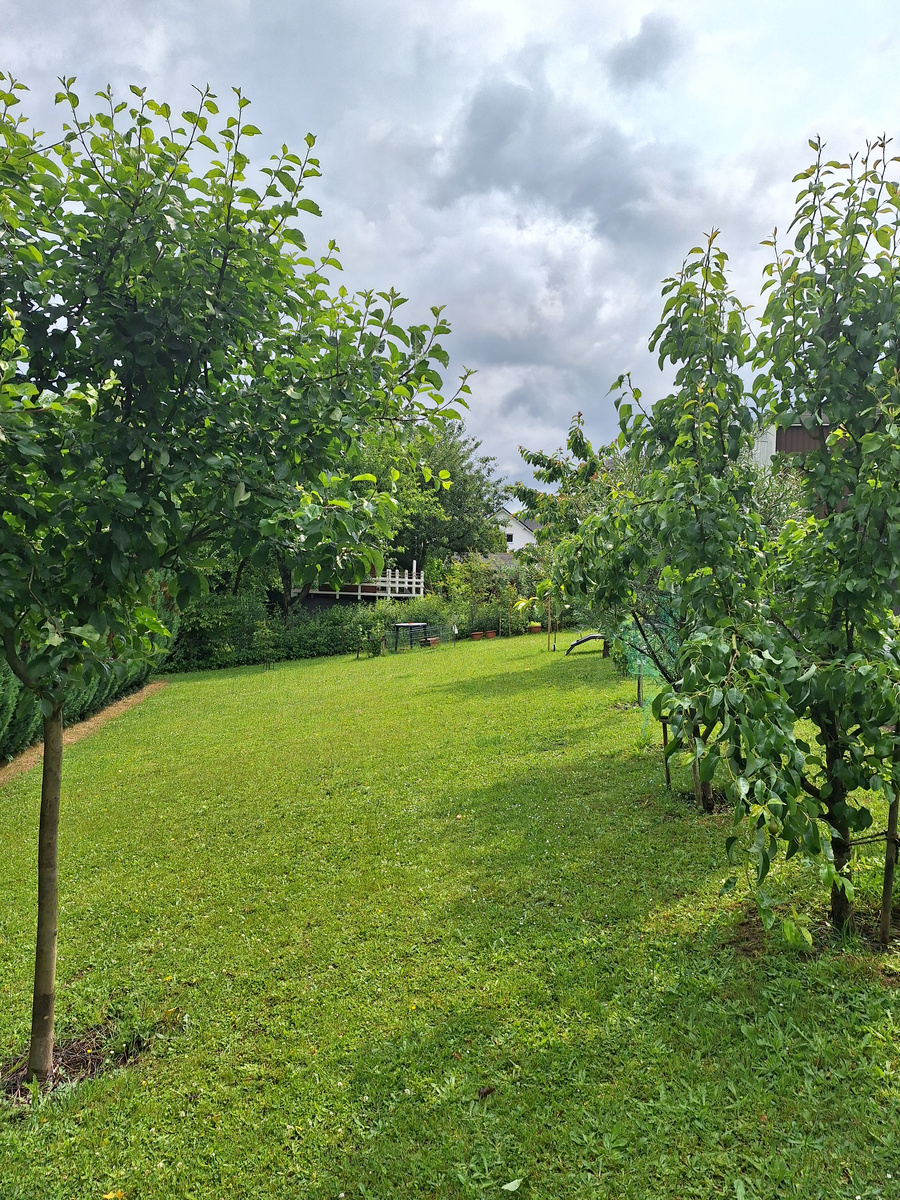 Начну с общего обзора в цифрах. Участок имеет размер ровно 6 соток ,на участке дом 100 квадратов ,но это на двух этажах дома ,так же на участке 2 гаража и сам сад ,он находится ниже уровня дома ,можно сказать уже на уровне другой улицы .Местность у нас холмисто-гористая ,вот какое слово я придумал . Я так на глаз прикинул что сад занимает половину участка ,3 сотки получается. Участки эти были нарезаны в 1953 году, а дом был построен позже, уже в 1955 году. Земли тогда под участки не жалели и это у нас ещё не самый большой участок ,есть и в два и три раза больше .Выши нашей улицы идут уже новые улицы ,примерно 80 и далее годов ,когда там началась застройка и что характерно ,чем застройка ближе к нашему времени ,тем участки становились всё меньше и меньше и современные участки поражают своим минимализмом ,то есть их практически нет и дома расположены так близко что отчётливо видно всё что происходит за окнами соседей ,как говорится ,окно в окно . Хорошо будет если на современном участке будет хоть одно место под машину и небольшая площадка, где можно пожарить шашлык и поставить стол со стульями. И в новых домах отсутствует келлер(цокольный этаж ),так как это стало сильно дорого . На участке у нас нет грядок, теплиц и прочих атрибутов деревенского быта. В основном у всех так и редко у кого увидишь грядки или теплицу, но есть конечно любители и выращивают что хотят. Ограничений на то, что садить на своём участке у нас нет, так же можно содержать и небольших животных и птицу. Где-то рядом постоянно слышно кур, совсем прям рядом. Кто-то держит кроликов. Раньше, это рассказывает бабушка соседка, ей в этом году будет в сентябре 90 лет, говорит, что бывшие хозяева нашего дома держали и поросят. Сейчас всё это в прошлом и мало кто увлекается животноводством на своих участках. Когда мы купили этот дом ,то всё было не так как сейчас ,была какая то жуткая брошенная площадка ,видимо была раньше терраса ,около дома стояла со стороны выхода в сад грязь похожая на мини болото .Сейчас везде тротуарная плитка ,вы это увидите на фото .Так же было невозможно подъехать к гаражам в плохую погоду ,но всё сейчас переделано .В саду был только один куст красной смородины ,но мы его убрали со временем и постепенно стали садить фруктовые деревья .Садоводы из нас очень не очень и толком не знали где покупать саженцы ,набрали всего в супермаркетах по акции ,деревья выросли ,урожая не было .Пару лет назад я стал всё старое убирать ,нашёл фирму которая продаёт саженцы с гарантией и стал менять все деревья .