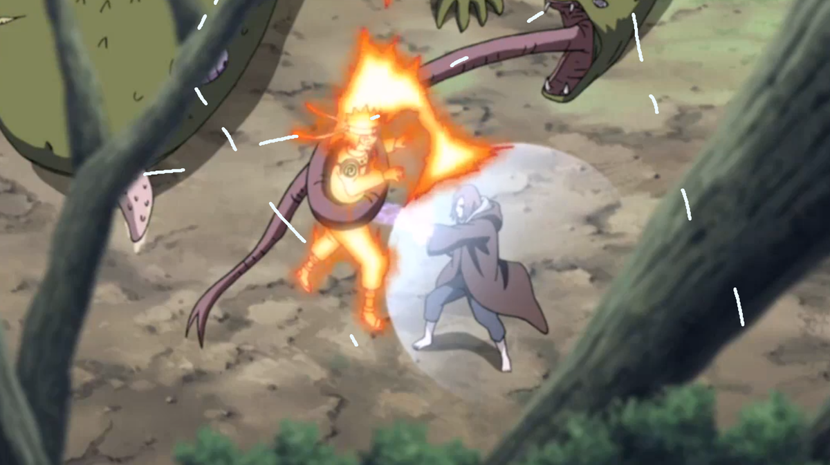 Например, он тянет душу из Наруто с помощью Нингендо, а когда Наруто пытается отбиться, используя чакро-руки с Расенганом, Нагато обрастает сферой поглощения чакры от Гакидо, поглощая и сам Расенган и даже покров Наруто, пока он не отменяет его.