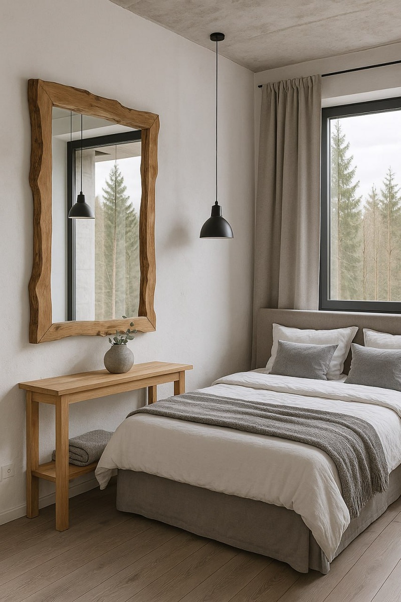 Зеркало в стиле леса и покоя: как одно изделие задаёт настроение всему интерьеру 🌲 Когда интерьер говорит шёпотом, но уверенно — перед нами настоящий скандинавский стиль. Минимум слов, максимум воздуха, света и натуральных текстур. Посмотрите на эту спальню: тёплый дуб, светлые стены, серый текстиль и окно в лес. Здесь всё просто, но продумано. И в центре композиции — зеркало в живой, "дикой" раме, которое сделала наша столярная мастерская. 🔸 Зеркало с характером Это не просто отражающая поверхность — это рама, в которой видно древесное волокно, изгибы, природную фактуру. Мы намеренно не выравнивали края — наоборот, подчеркнули естественные линии древесины. Раму мы вырезали вручную из массива дуба, без шпона и имитаций. Финиш — натуральное масло, которое сохраняет структуру и глубину цвета. Такое зеркало — не просто часть интерьера. Это его акцент, его дыхание. 🔸 Почему этот стиль работает Скандинавский интерьер любит: натуральные материалы (дуб, лен, шерсть), функциональность