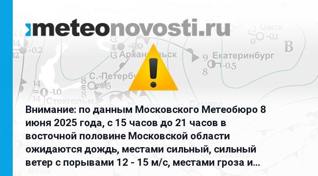Внимание: по данным Московского Метеобюро 8 июня 2025 года, с 15 часов до 21 часов в восточной половине Московской области ожидаются дождь