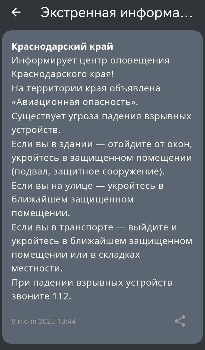 ⚡️На Черноморском побережье объявили ракетную опасность Ракетную опасность объявили на Черноморском побережье, сообщила единая государственная система предупреждения и ликвидации чрезвычайных ситуаций (РСЧС) в приложении МЧС в 12:41. По всему Краснодарскому краю объявили сигнал ракетной опасности в 12:40. Сама опасность действует в том числе в Сочи, Новороссийске, Сириусе. До этого ракетная опасность действовала в Крыму с 11:19 до 11:24, с 11:34 до 11:59, а также с 12:09 до 12:34. Власти регулярно сообщают о ракетной опасности в регионе. Так, в ночь на 4 июня она действовала на Черноморском побережье три часа — была объявлена в 23:13, о снятии угрозы проинформировали в 2:12. 🔥 Подписаться | Поделиться