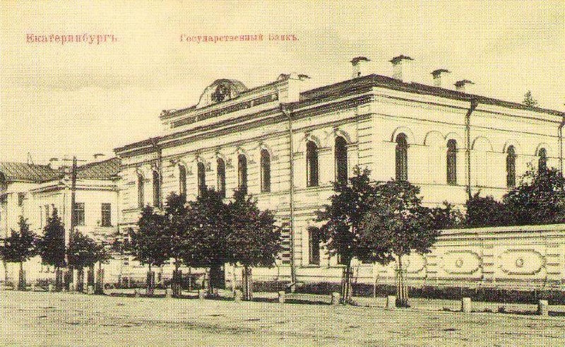 Екатеринбургская контора Государственного банка Российской Империи Фото 1900-1910 год. В первой половине XIX века на участке под № 6 по Главному проспекту (ныне проспект Ленина) был возведен комплекс сооружений, предназначенный для размещения Екатеринбургской конторы Государственного банка Российской Империи. По данным 1889 года в состав усадьбы, занимаемой банком, входили каменный двухэтажный дом, флигель и службы. В конце XIX века возникла необходимость расширения площадей, и вблизи первого здания конторы банка по проекту инженера И.Л. Фальковского в 1895 году было возведено новое двухэтажное каменное здание. Объект представляет собой образец делового дома второй половины XIX столетия. Ограда с воротами состоит из двух фрагментов, фланкирующих второе здания банка. Сооружены в 1895 году на месте флигеля. На восточном фрагменте ограды сохранилась изящная ажурная решетка. (Решетка самих ворот – «новодел»).