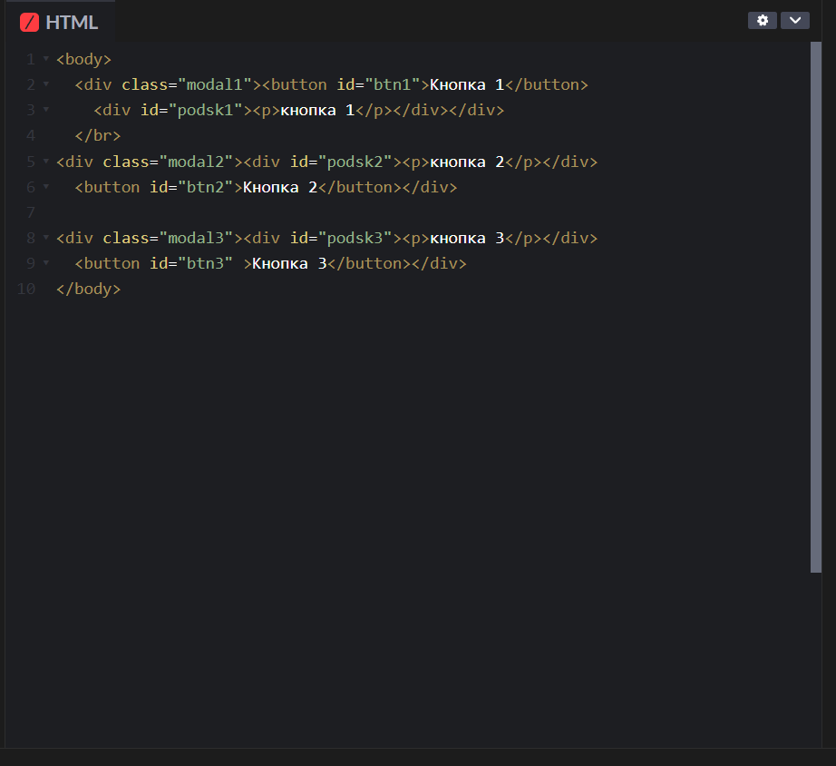 ТЗ - создать HTML-страницу и разместить на ней несколько кнопок. При наведении на кнопку должна появляться подсказка сверху или, если нет места, снизу. <body> <div class="modal1"><button id="btn1">Кнопка 1</button> <div id="podsk1"><p>кнопка 1</p></div></div> </br> <div class="modal2"><div id="podsk2"><p>кнопка 2</p></div> <button id="btn2">Кнопка 2</button></div> <div class="modal3"><div id="podsk3"><p>кнопка 3</p></div> <button id="btn3" >Кнопка 3</button></div> </body> #podsk1, #podsk2, #podsk3{ position: fixed; position:abcolute; border:1px solid; width:70px; height:30px; border-radius:15px; background:#DEB887; } p{ margin:auto; } #podsk1{ margin-top:15px; } #podsk2, #podsk3{ margin-top:-55px; } .modal2{ margin-left:100px; display:inline-block; margin-top:50px; } .modal3{ margin-left:100px; display:inline-block; margin-left:250px; margin-top:50px; } .modal1{ position:relative; } .modal1, .modal2, .modal3{ width:100px; height:100px; position: fixed; } const btn1 = document.getElem