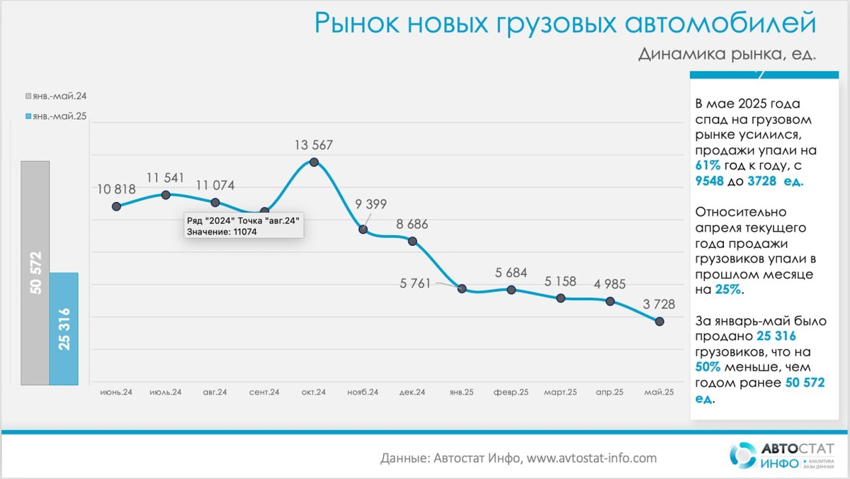 Тяжелый месяц для тяжелых машин Согласно данным «Автостат Инфо», объем рынка сократился на 25% по сравнению с апрелем — с 4985 до 3728 единиц. По отношению к маю прошлого года снижение еще значительнее: минус 61% (с 9548 единиц в мае 2024 года до 3728 в мае 2025-го). Наибольшие потери пришлись на сегмент иномарок — продажи импортных грузовиков снизились на 73% (с 6364 до 1720 единиц). Продажи российских моделей сократились на 37% — с 3184 до 2008 единиц. По итогам января–мая 2025 года в России было реализовано 25 316 новых грузовиков — это на 50% меньше, чем за аналогичный период 2024 года (50 572 единицы). Несмотря на общий спад, КАМАЗ смог увеличить свою долю на рынке до 32% (годом ранее — 19%), даже при снижении продаж на 34% — с 1812 до 1191 единицы. ГАЗ также увеличил долю с 6,3% до 9,8%, хотя его продажи сократились на 39% — с 598 до 365 единиц. КАМАЗ и ГАЗ по-прежнему занимают два первых места в рейтинге марок на рынке новых грузовиков. На третьем месте в майском рейтинге —