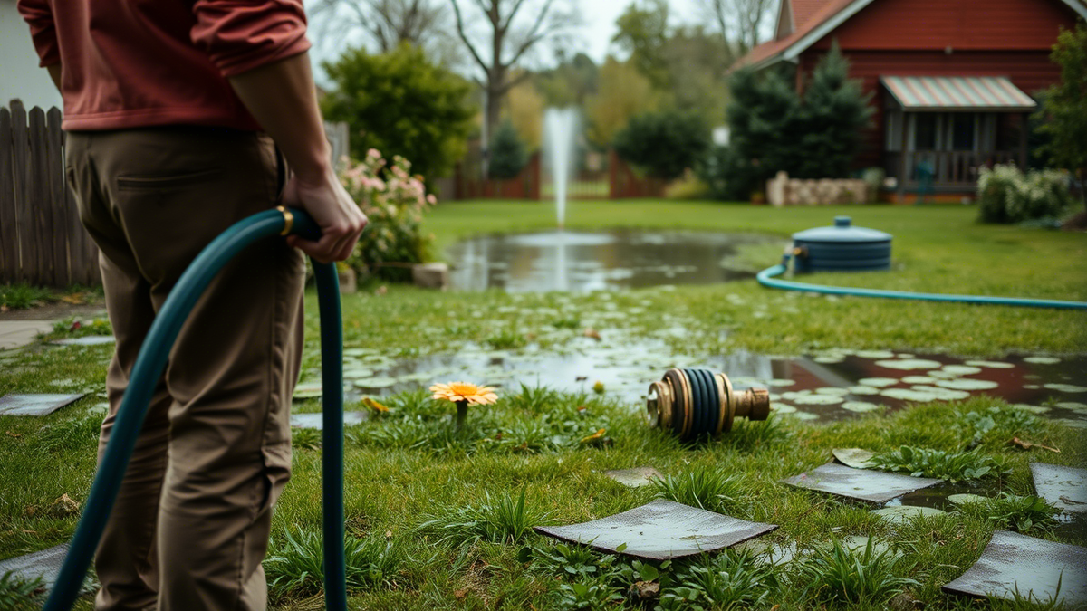 Переходник лопнул. Шланг отвалился. Вся вода из пруда льётся к соседу.