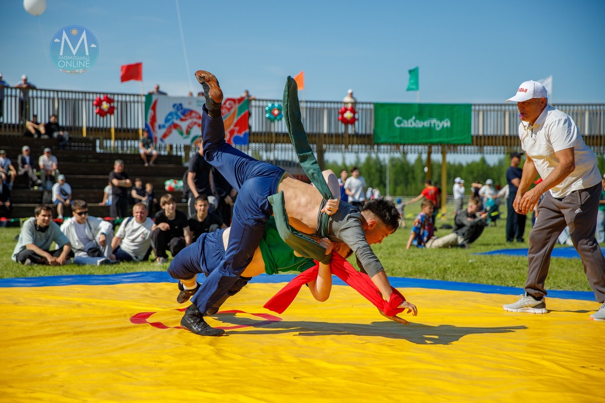 Яркие кадры "Сабантуй - 2025". Одним из самых зрелищных и эмоциональных моментов - Татарская национальная борьба Көрәш!