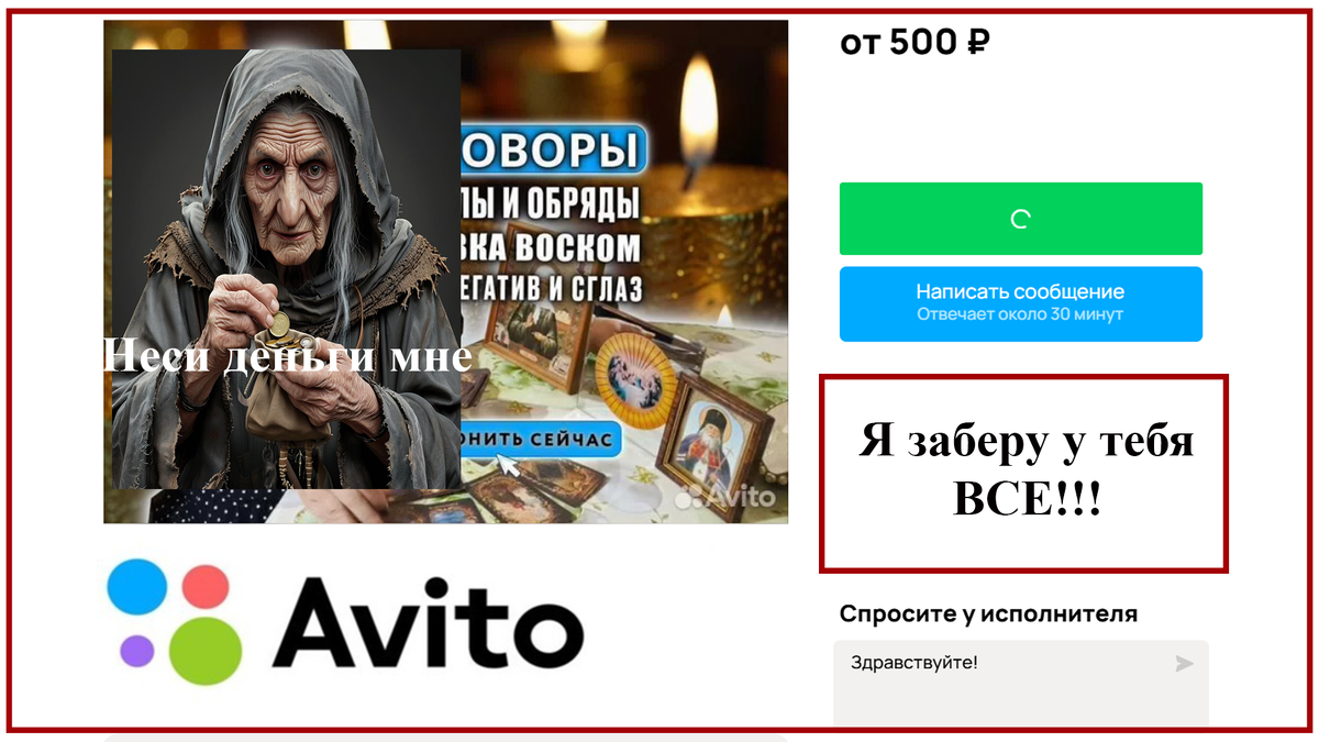 Через 2 часа супер увлекательной беседы она сказала, что меня нужно срочно чистить, этот сеанс будет стоить мне 15 тысяч рублей, а чистка еще 20, но сейчас уже нет времени, ведь ей нужно подготовиться, я согласился и даже снял, как передаю ей деньги на камеру, конечно, скрипя сердцем, но передал. Тогда я радостно ее поблагодарил, сказал, что она мне помогла, стало легче, что понимаю, что еще не всё, но тем не менее спасибо, если кратко, то нес бред. Выйдя из дома, я заглянул в окно комнаты, в которой была закрыта дверь, и там, внимание, я увидел молодого парня, который сидел за компьютером, на котором было 2 монитора, в которых было открыто вкладок 10, и знаете, что там было? Личные страницы мои, моей жены, моих близких и даже коллег. Я был в шоке, всё было сфотографировано, но здесь, думаю, публиковать не стоит.
