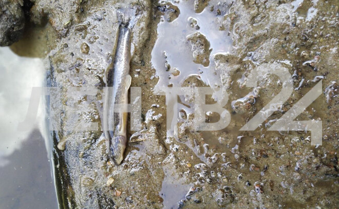 Рыба в водоеме вялая, поднимается к поверхности и глотает воздух. На берегу и в прибрежной зоне обнаружена погибшая рыба. Окрестности накрывает неприятный едкий запах.