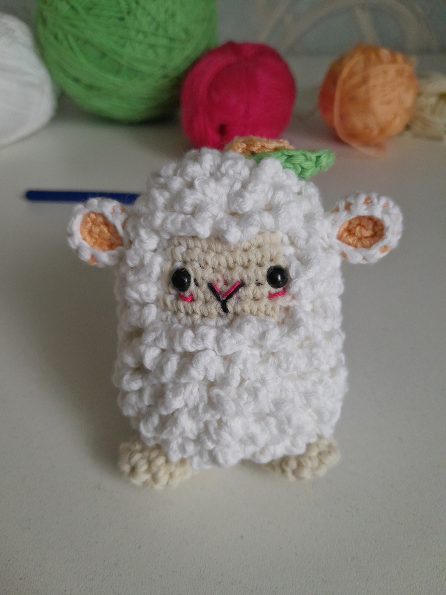Овечка вяжется крючком сверху вниз как одно целое. Уши, ноги, цветок и лист