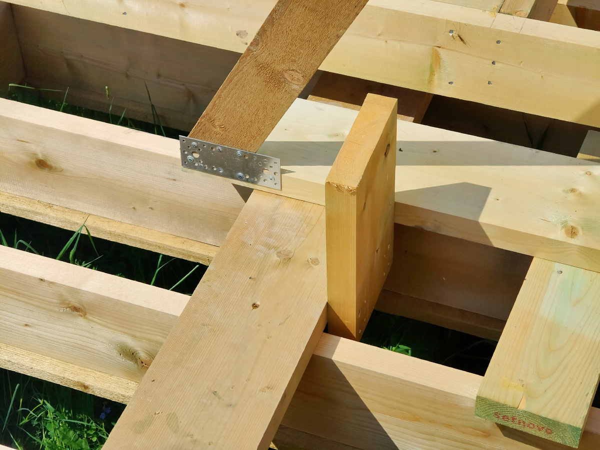 Временный настил по решётчатому каркасу перекрытия для работы я делать не стал, так как уже приноровился свободно ходить по рёбрам досок. Здесь важно только не переоценить свои возможности и делать все шаги обдуманно и глядя в упор в те точки, куда собираешься шагнуть, чтобы ненароком не промазать или не наступить на край какого-нибудь незакреплённого обрезка доски, плашмя лежащего на каркасе перекрытия.