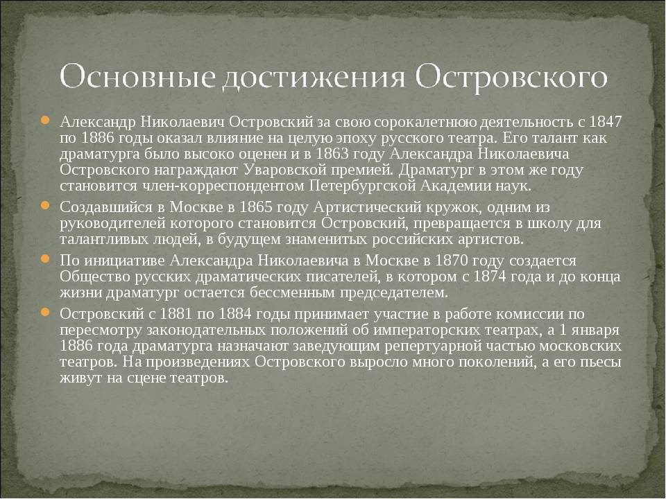 Александр Николаевич Островский — один из величайших русских драматургов XIX века, чьи пьесы, такие как «Гроза», «Бесприданница» и «Лес», до сих пор ставятся на сценах театров и изучаются в учебных заведениях. Его творчество оказало огромное влияние на развитие русской драматургии и театра. Однако жизнь самого Островского была полна интересных и порой драматических событий. В этой статье мы рассмотрим некоторые малоизвестные факты из его биографии. Александр Николаевич Островский родился 31 марта 1823 года в Москве в семье чиновника Николая Фёдоровича Островского и его жены Любови Ивановны. С детства Александр проявлял интерес к литературе и театру, что определило его дальнейший путь. Островский получил юридическое образование в Московском университете, однако его больше привлекала литература. Уже в студенческие годы он начал писать свои первые пьесы и участвовал в студенческих литературных кружках. После окончания университета он работал в судах, что дало ему богатый жизненный матери