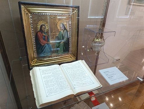 В первой витрине выставки можно увидеть старинную икону «Троицы Новозаветной», посвящённую празднику и раскрывающую его суть. Это особый вариант изображения Триединого Божества: Отца, Сына и Святого Духа.